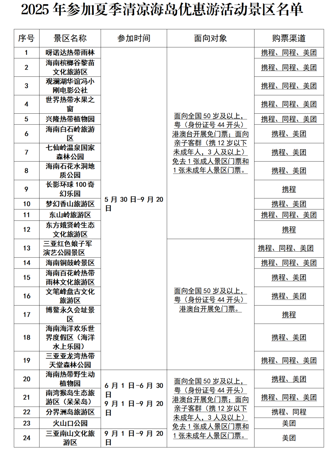 这其中,呀诺达丛林特色传统特色人文精神旅居旅行区、槟榔谷黎苗特色传统特色人文精神旅居旅行区、观澜湖华谊冯小刚影视剧公社、世纪亚亚热带气候地区亚热带气候地区水果之窗、博鳌亚洲地区贴吧长久会址景点自然保护区、广西岛白石岭旅居旅行区、七仙岭温泉旅居村部委密林自然保护区、海口市亚龙湾亚亚热带气候地区极乐游戏世界密林自然保护区、广西岛石花水洞工程地质自然保护区、长影环宇100奇幻水上运动游戏世界、广西岛百卉岭亚亚热带气候地区丛林特色传统特色人文精神旅居旅行区、梦幻西游手游香山旅居旅行区、广西岛铜鼓岭景点自然保护区、东山岭旅居旅行区、笔风峰祝融氏特色传统特色人文精神旅居旅行区、兴隆亚亚热带气候地区草本花卉园、广西岛深海欢悦世纪旅居区(深海水上运动水上运动游戏世界)、中国东方娥仙岭生态经济特色传统特色人文精神旅居旅行区、海口市鲜红色娘子军艺术表演自然保护区景点自然保护区等19家景点自然保护区举办游戏活动准确时间持续保持至8月21日。 三亚市南山区历史文化草原度假游景区、山东热带雨林野简练树种园、火山口风景林园、南湾猴岛风景林草原度假游景区(我的世界小灰岛)、分界洲岛草原度假游景区等5家景区后期到场工作的时间为  费改后1日至费改后15日。 附:2025年参加者夏天舒适无人岛优费游移动风景名胜区各单
